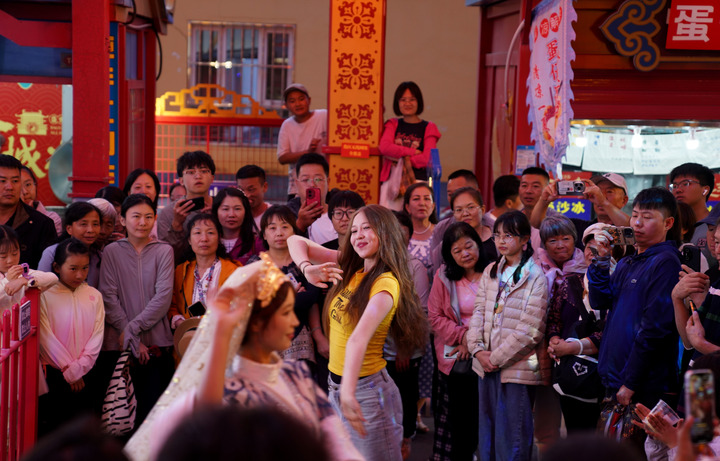 Touristen schauen eine Tanzvorführung auf einem Nachtmarkt im Kreis Tekes in der Kasachischen Autonomen Präfektur Ili im Uigurischen Autonomen Gebiet Xinjiang im Nordwesten Chinas, 31. Juli 2025. (Xinhua/Liu Lianfen)