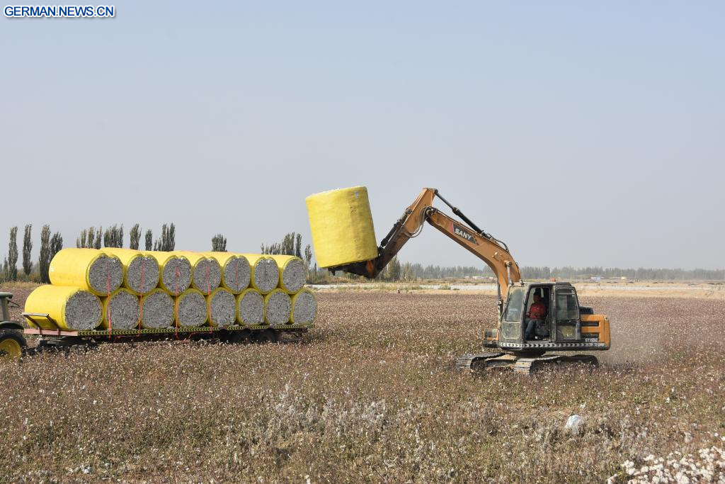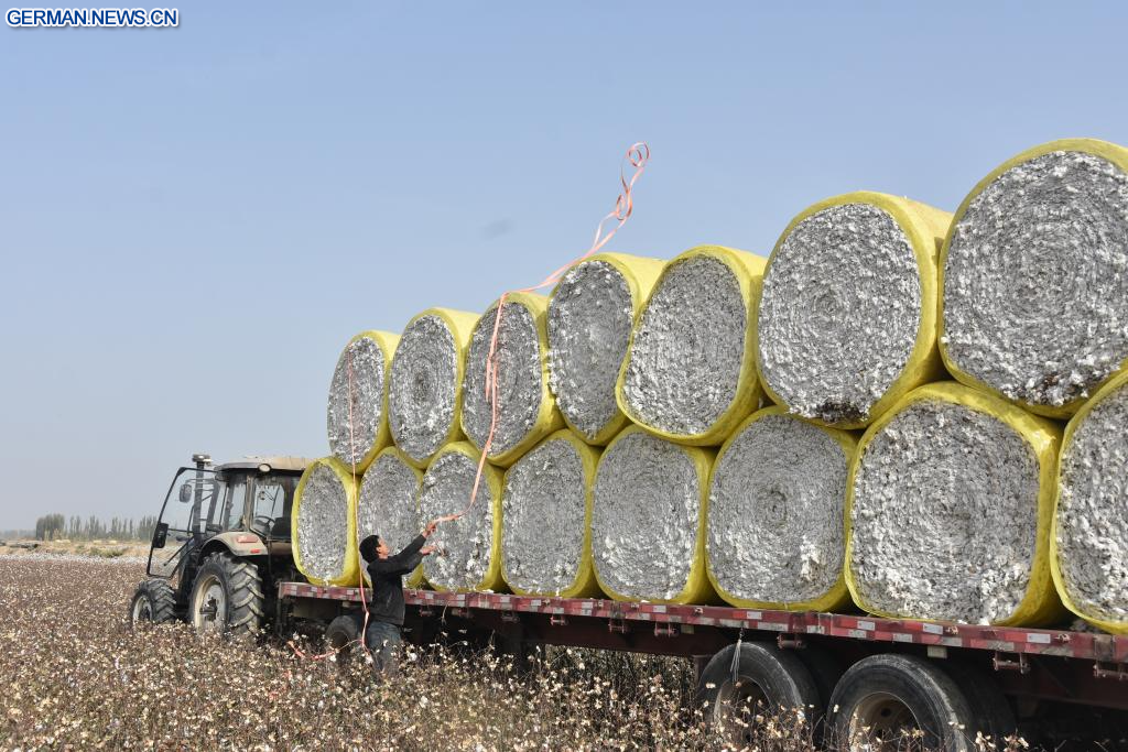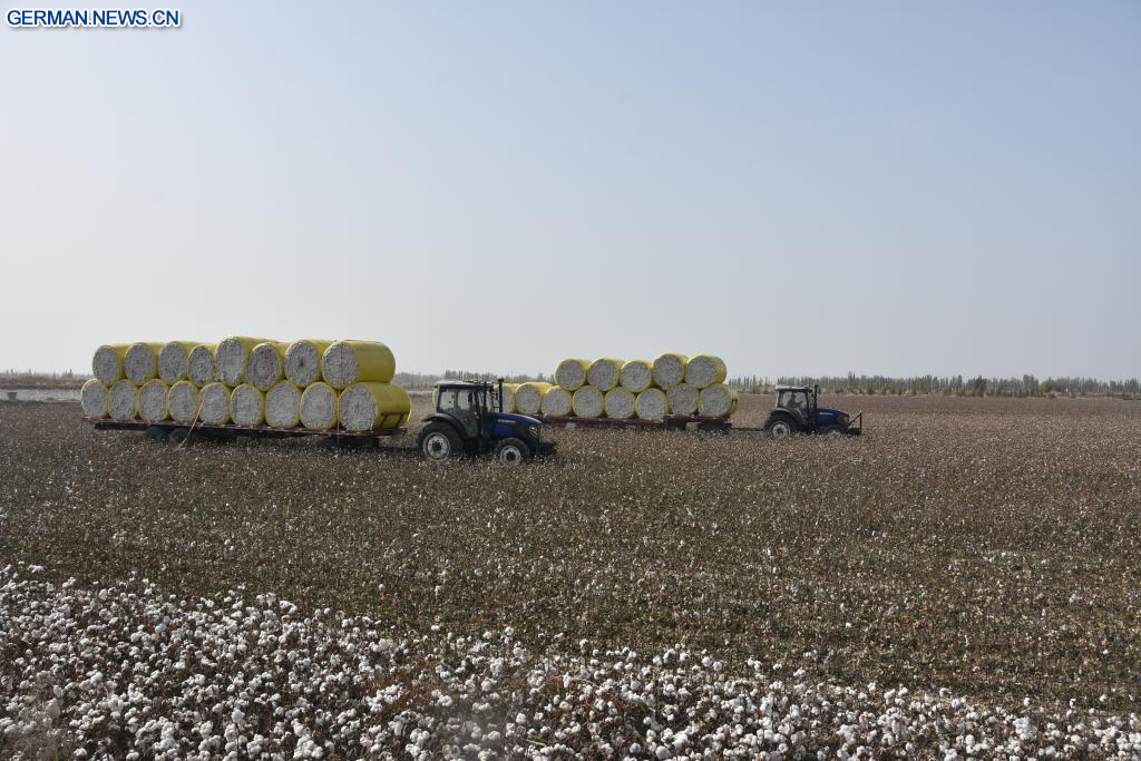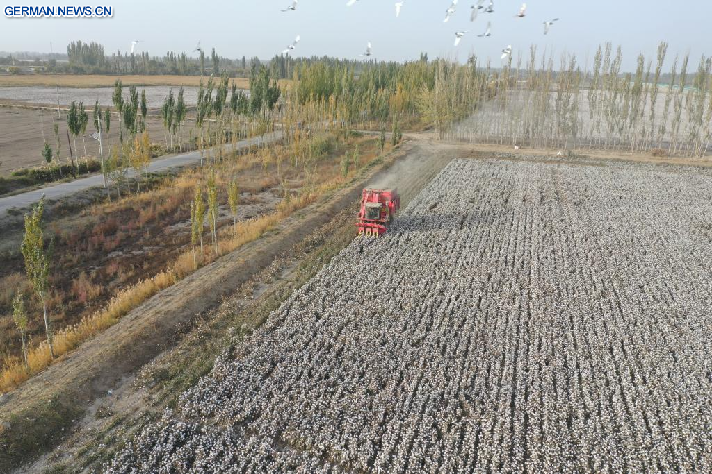 AKSU(XINJIANG), 21. Oktober 2025 (Xinhuanet) -- Die Luftaufnahme einer Drohne zeigt einen Baumwollpflücker auf einem Feld im Kreis Xayar in Aksu im nordwestchinesischen Uigurischen Autonomen Gebiet Xinjiang, 21. Oktober 2025. Im Kreis Xayar hat die Baumwollerntesaison begonnen. (Quelle: Xinhua/Su Chuanyi)