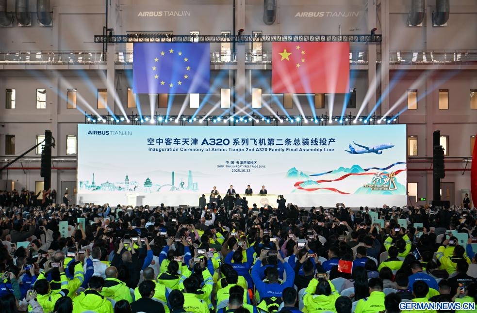 TIANJIN, 22. Oktober 2025 (Xinhuanet) -- Das Foto zeigt die zweite Endmontagelinie (FAL) von Airbus für Flugzeuge der A320-Familie in Tianjin, Nordchina, 22. Oktober 2025.