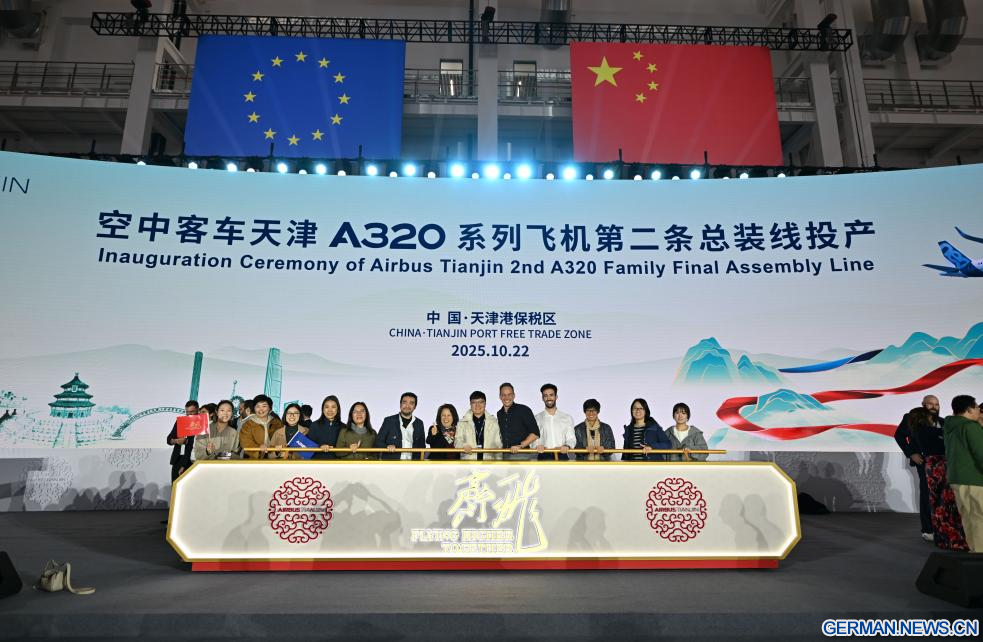 Airbus hat am Mittwoch seine neueste Endmontagelinie (FAL) für Flugzeuge der A320-Familie in der nordchinesischen Hafenstadt Tianjin eingeweiht, die zweite ihrer Art in China und ganz Asien. (Quelle: Xinhua/Sun Fanyue)