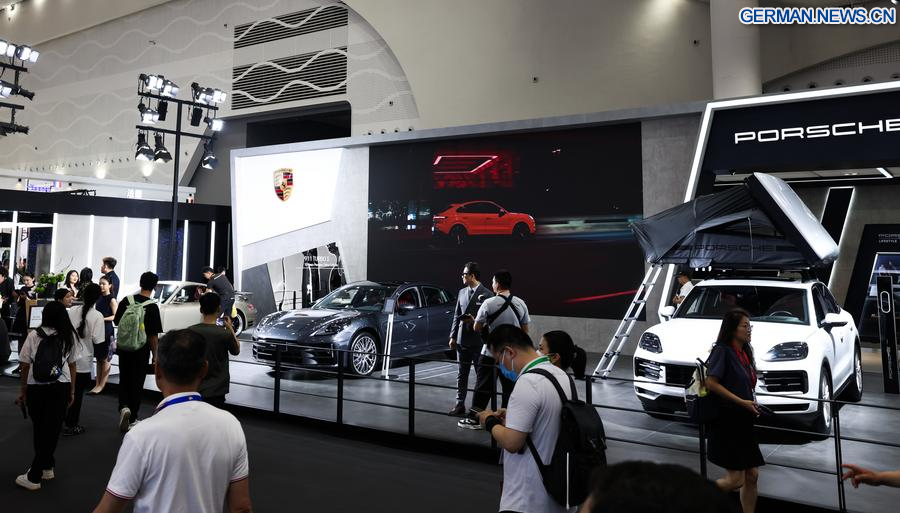 Das Foto zeigt ausgestellte Porsche-Fahrzeuge auf der 4. China International Consumer Products Expo (CICPE) in Haikou, der Hauptstadt der Provinz Hainan in Südchina, 14. April 2024. (Xinhua/Yang Guanyu)