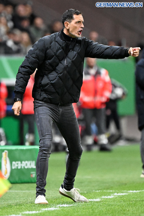 FRANKFURT, 29. Oktober 2025 (Xinhua) -- Dino Toppmöller, Cheftrainer von Eintracht Frankfurt, gestikuliert während der Zweitrundenbegegnung im DFB-Pokal gegen Borussia Dortmund in Frankfurt, 28. Oktober 2025. (Foto von Ulrich Hufnagel/Xinhua)