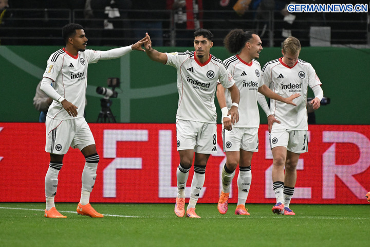 FRANKFURT, 29. Oktober 2025 (Xinhua) -- Ansgar Knauff (erster von links) von Eintracht Frankfurt feiert ein Tor mit seinen Mitspielern während der Zweitrundenbegegnung im DFB-Pokal gegen Borussia Dortmund in Frankfurt, 28. Oktober 2025. (Foto von Ulrich Hufnagel/Xinhua)