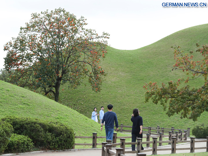 GYEONGJU, 30. Oktober 2025 (Xinhua) -- Touristen besuchen die antike Grabstätte Daereungwon in Gyeongju in Südkorea, 17. Oktober 2025. Gyeongju, eine Stadt im Südosten Südkoreas, wird oft als „Freilichtmuseum” bezeichnet, da sie die Stadt mit den meisten UNESCO-Welterbestätten des Landes ist. (Xinhua/Yao Qilin)