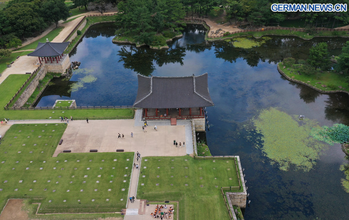 GYEONGJU, 30. Oktober 2025 (Xinhua) -- Die Luftaufnahme einer Drohne zeigt den Donggung-Palast und den Wolji-Teich in Gyeongju in Südkorea, 21. September 2025. Gyeongju, eine Stadt im Südosten Südkoreas, wird oft als „Freilichtmuseum” bezeichnet, da sie die Stadt mit den meisten UNESCO-Welterbestätten des Landes ist. (Xinhua/Yao Qilin)