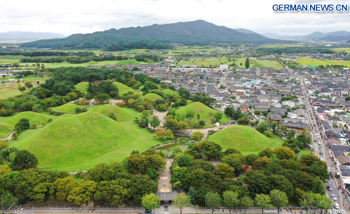 GYEONGJU, 30. Oktober 2025 (Xinhua) -- Die Luftaufnahme einer Drohne zeigt die antike Grabstätte Daereungwon in Gyeongju in Südkorea, 21. September 2025. Gyeongju, eine Stadt im Südosten Südkoreas, wird oft als „Freilichtmuseum” bezeichnet, da sie die Stadt mit den meisten UNESCO-Welterbestätten des Landes ist. (Xinhua/Yao Qilin)