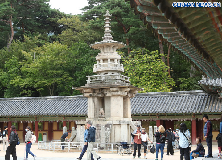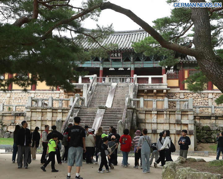 GYEONGJU, 30. Oktober 2025 (Xinhua) -- Das Foto zeigt Besucher im Bulguksa-Tempel in Gyeongju in Südkorea, 17. Oktober 2025. Gyeongju, eine Stadt im Südosten Südkoreas, wird oft als „Freilichtmuseum” bezeichnet, da sie die Stadt mit den meisten UNESCO-Welterbestätten des Landes ist. (Xinhua/Yao Qilin)