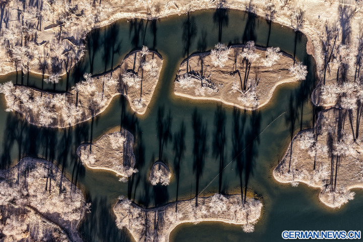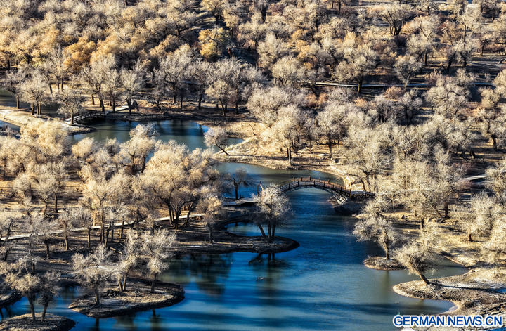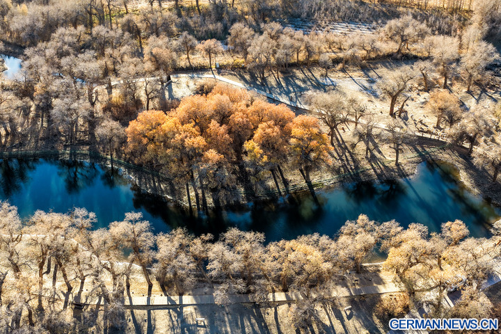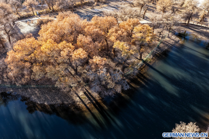 EJINA-BANNER, 31. Oktober 2025 (Xinhua) -- Die Luftaufnahme einer Drohne zeigt einen Wald aus Euphrat-Pappeln im Ejina-Banner in der Autonomen Region Innere Mongolei in Nordchina, 30. Oktober 2025. (Xinhua/Lian Zhen)
