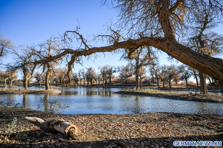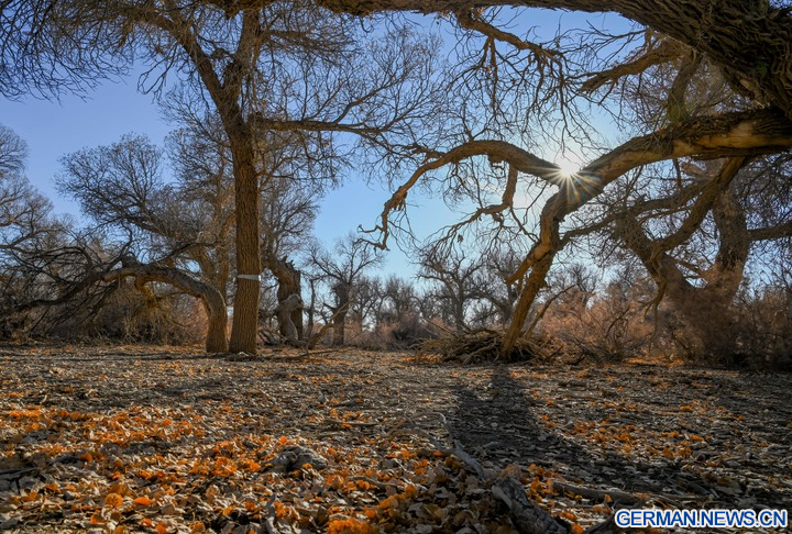 EJINA-BANNER, 31. Oktober 2025 (Xinhua) -- Das Foto zeigt einen Wald aus Euphrat-Pappeln im Ejina-Banner in der Autonomen Region Innere Mongolei in Nordchina, 30. Oktober 2025. (Xinhua/Lian Zhen)