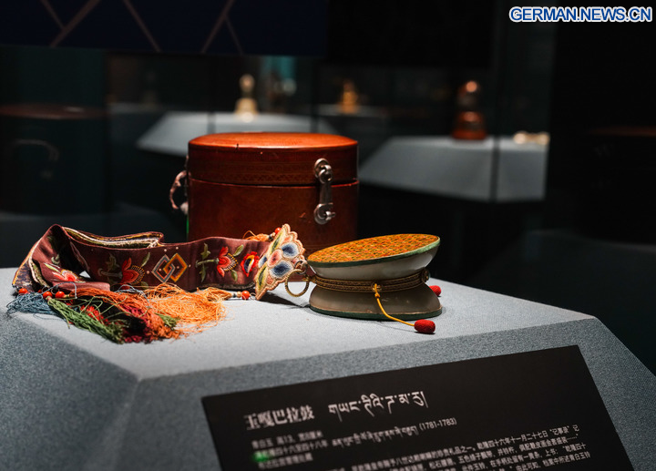 LHASA, 2. November 2025 (Xinhua) -- Das Foto zeigt Exponate während einer Ausstellung im Xizang-Museum in Lhasa im Südwesten des autonomen Gebiets Xizang in China, 30. Oktober 2025. Anlässlich des 60. Jahrestags der Gründung des autonomen Gebiets findet in Lhasa eine gemeinsame Ausstellung mit Kulturgütern aus dem Palastmuseum, dem Xizang-Museum, dem Potala-Palast und dem Norbulingka statt. Die Ausstellung dauert bis zum 1. Dezember. (Xinhua/Zhou Jiayi)