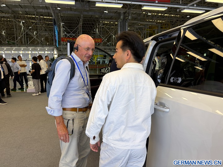 Wolfgang Müller (erster von links) in einer multinationalen Mediendelegation in Xinjiang, beim Besuch einer Automobilfabrik in Xinjiang und im Gespräch mit einem Mitarbeiter, 9. September 2025. (Xinhua/Guzalnur Tayerjan)