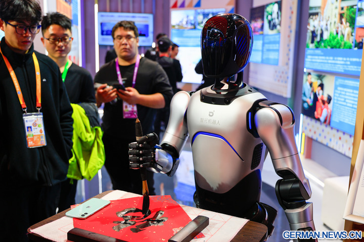 SHANGHAI, 6. November 2025 (Xinhua) -- Ein Roboter schreibt das Schriftzeichen „fu“ („Glück“) im China-Pavillon auf der 8. Internationalen Importmesse Chinas (CIIE) in Shanghai in Ostchina, 5. November 2025. Die 8. Internationale Importmesse Chinas (CIIE) wurde am Mittwoch in Shanghai eröffnet. Zu den Höhepunkten des China-Pavillons zählen Chinas neueste Errungenschaften bei der umfassenden Vertiefung der Reformen und der Öffnung auf hohem Niveau während der Laufzeit des 14. Fünfjahresplans (2021-2025). (Xinhua/Liu Jiaqi)