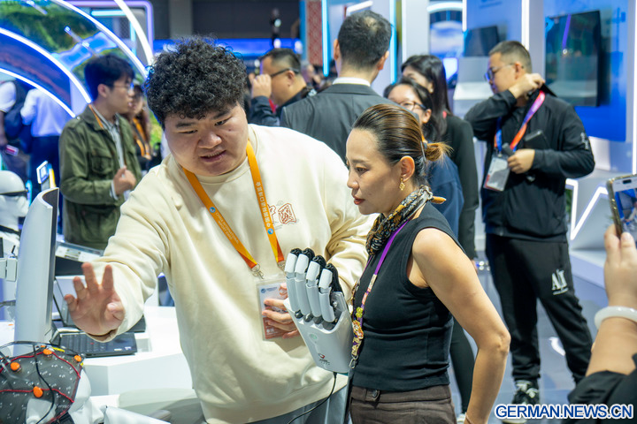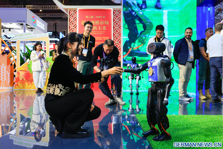 SHANGHAI, 6. November 2025 (Xinhua) -- Eine Besucherin informiert sich über einen Roboter mit nicht-invasiver Gehirn-Computer-Schnittstelle im China-Pavillon auf der 8. Internationalen Importmesse Chinas (CIIE) in Shanghai in Ostchina, 5. November 2025. Die 8. Internationale Importmesse Chinas (CIIE) wurde am Mittwoch in Shanghai eröffnet. Zu den Höhepunkten des China-Pavillons zählen Chinas neueste Errungenschaften bei der umfassenden Vertiefung der Reformen und der Öffnung auf hohem Niveau während der Laufzeit des 14. Fünfjahresplans (2021-2025). (Xinhua/Ding He)