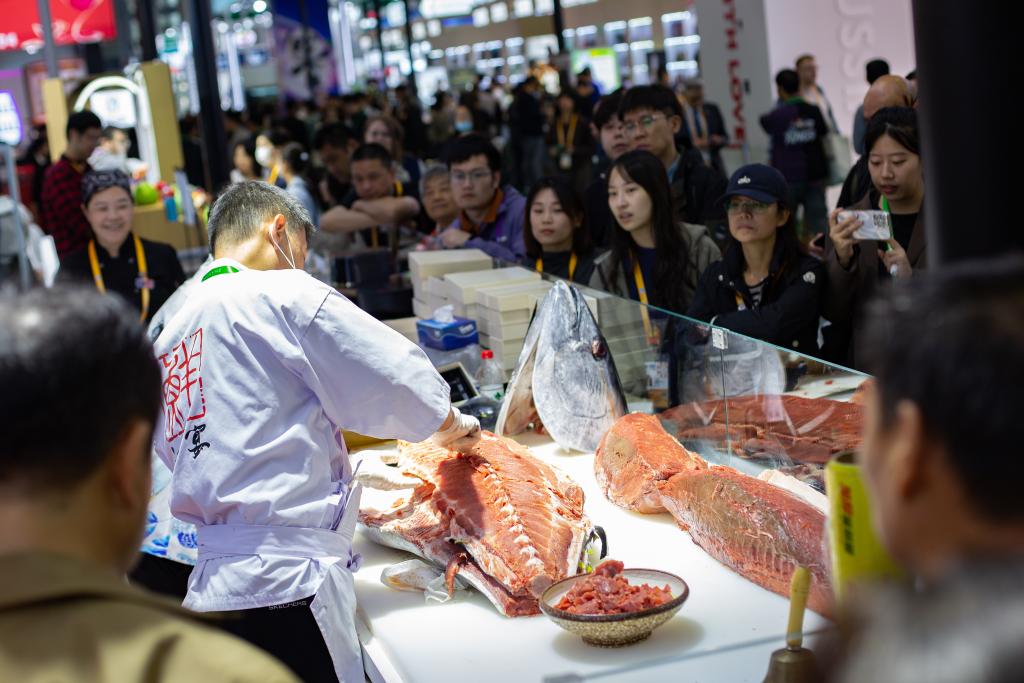 SHANGHAI, 7. November 2025 (Xinhuanet) -- Ein Mitarbeiter schneidet während einer Fischzerlegungsshow im Ausstellungsbereich für Lebensmittel und Agrarprodukte auf der achten Internationalen Importmesse Chinas (CIIE) im ostchinesischen Shanghai einen über 100 Kilogramm schweren Thunfisch, 7. November 2025. (Quelle: Xinhua/Tian Weiwei)