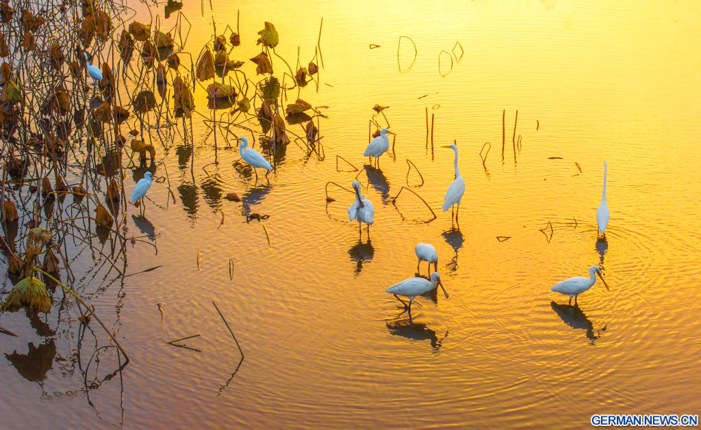 BEIJING, 10. November 2025 (Xinhuanet) -- Das Drohnenfoto zeigt Reiher bei der Suche nach Futter an einem Stausee im Kasachischen Autonomen Kreis Aksay in der nordwestchinesischen Provinz Gansu, 9. November 2025. (Foto von Gao Hongshan/Xinhua)