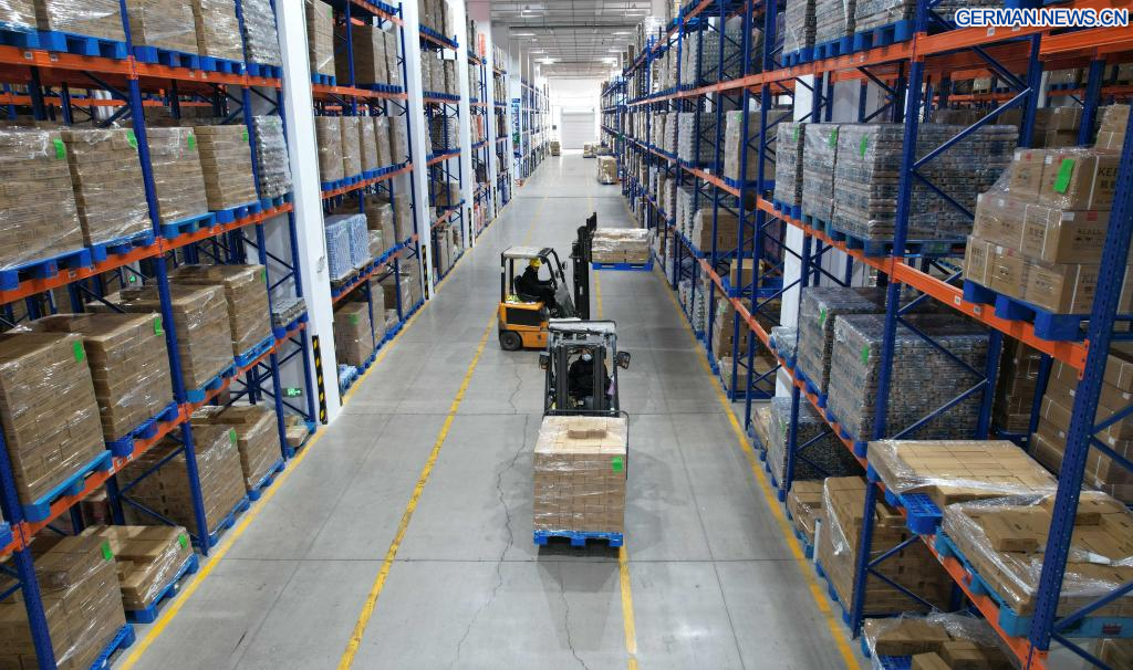BEIJING, 10. November 2025 (Xinhuanet) -- Das Drohnenfoto vom 10. November 2025 zeigt Arbeiter, die mit Gabelstaplern Pakete transportieren, in einem Logistikpark für Tierfutter in der Gemeinde Tongjing in der Stadt Linyi in der ostchinesischen Provinz Shandong. (Foto von Wang Yanbing/Xinhua)
