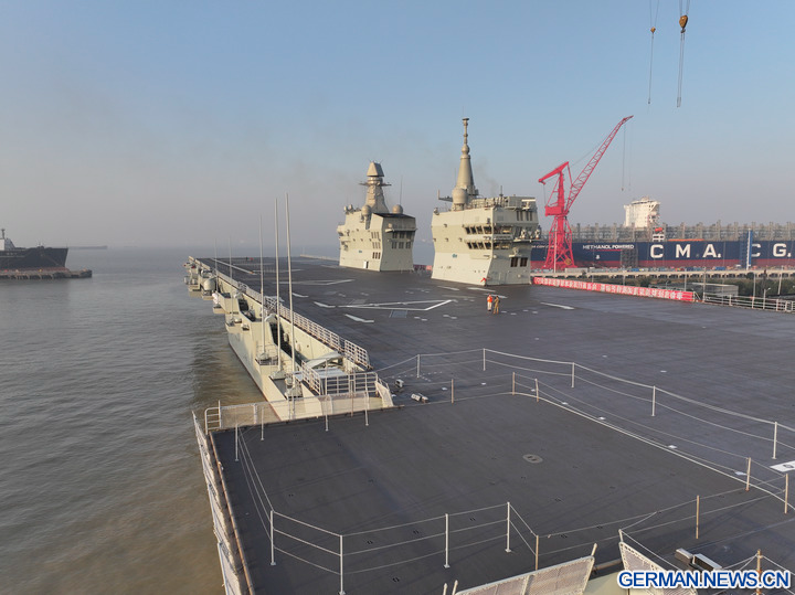 SHANGHAI, 14. November 2025 (Xinhua) -- Chinas erstes amphibisches Angriffsschiff vom Typ 076, das Schiff „Sichuan“ der Marine der chinesischen Volksbefreiungsarmee, läuft aus dem Hafen der Hudong-Zhonghua Shipbuilding (Group) Co., Ltd. in Shanghai in Ostchina aus, 14. November 2025.