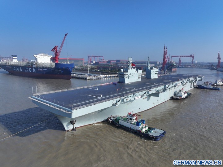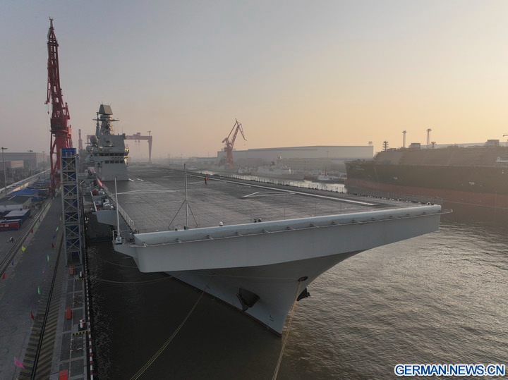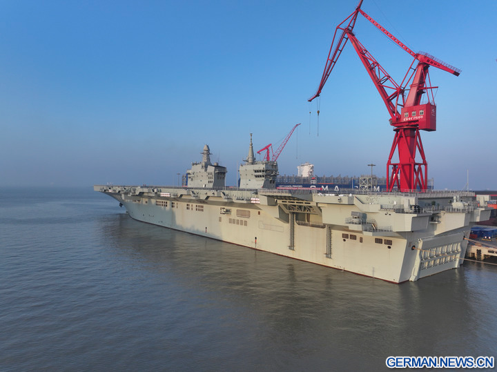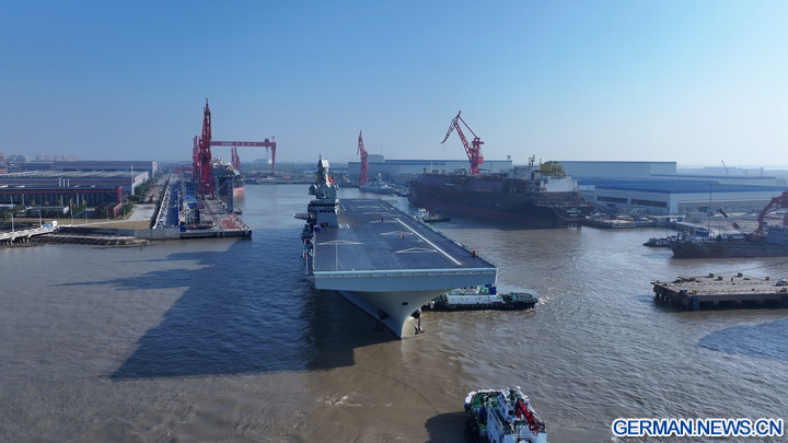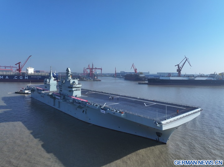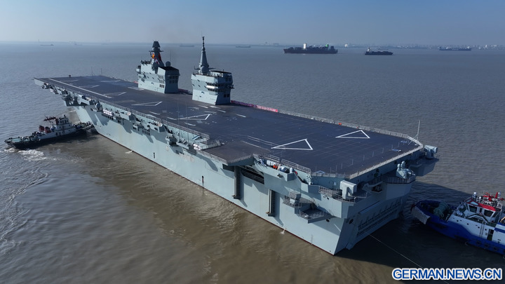 Das Schiff „Sichuan“ der Marine der chinesischen Volksbefreiungsarmee lief am Freitagmorgen aus Shanghai aus, um seine erste Navigations-Testmission durchzuführen. Der Seeversuch konzentriert sich auf die Prüfung und Verifizierung der Zuverlässigkeit und Stabilität der Antriebssysteme, der Elektrik und anderer Systeme des Schiffes. (Foto von Zhang Liang/Xinhua)
