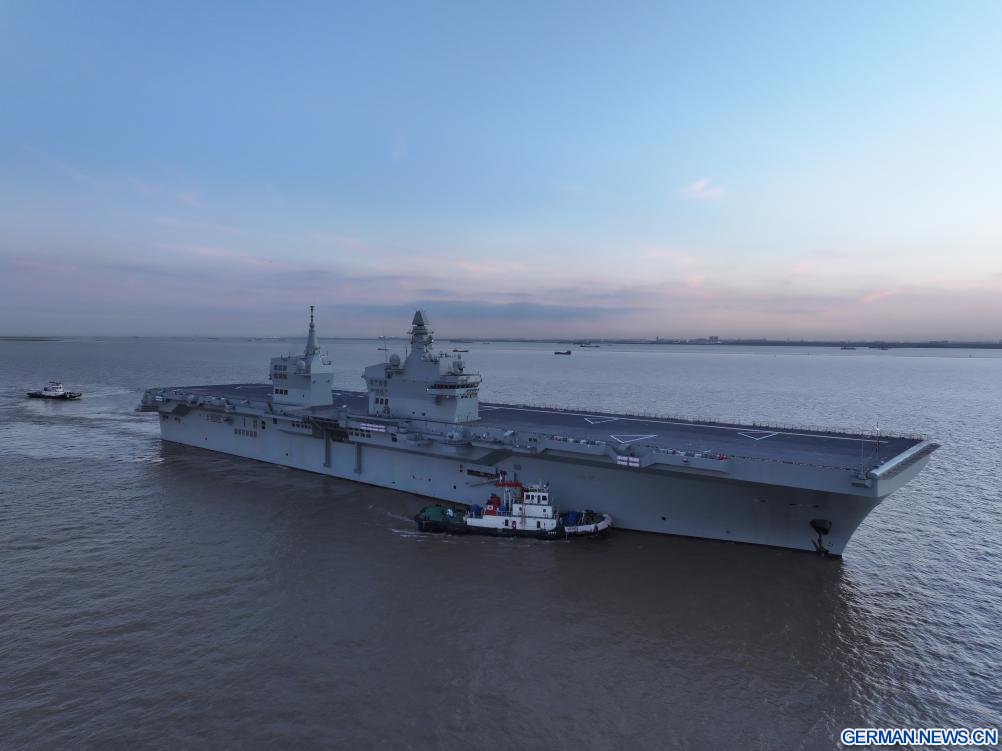 SHANGHAI, 16. November 2025 (Xinhuanet) -- Chinas erstes amphibisches Angriffsschiff vom Typ 076, das Schiff „Sichuan“, ist unterwegs, 15. November 2025. Das Schiff „Sichuan“ kehrte am Sonntag gegen 17 Uhr nach Abschluss seiner ersten Probefahrt auf See in die Werft in Shanghai zurück.
