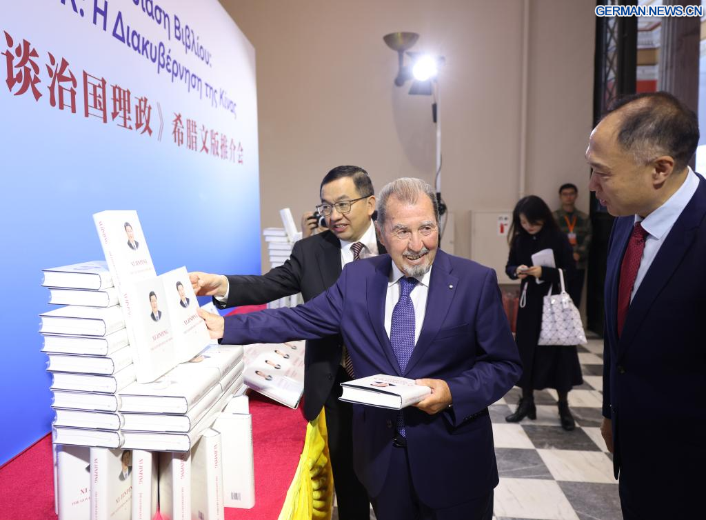 ATHEN, 19. November 2025 (Xinhuanet) -- Ioannis Tragakis, Vorsitzender der Griechenland-China-Freundschaftsgruppe im griechischen Parlament, nimmt an einer Zeremonie zur Vorstellung der griechischen Ausgabe von „Xi Jinping: China regieren“ in Athen, Griechenland, teil, 18. November 2025. (Foto von Lefteris Partsalis/Xinhua)