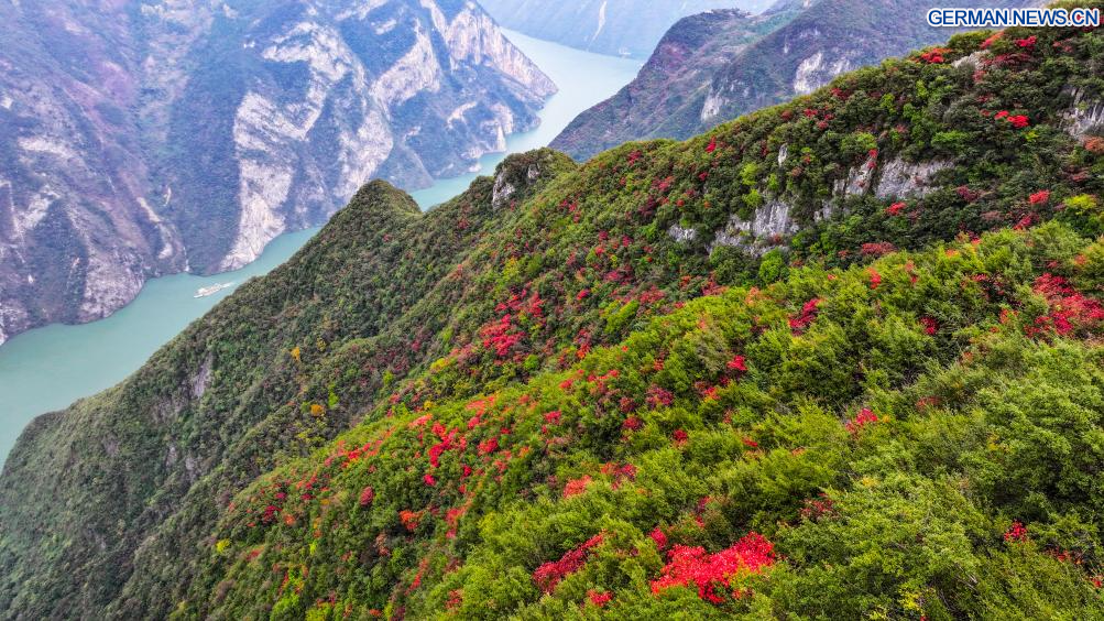 CHONGQING, 22. November 2025 (Xinhuanet) -- Die Luftaufnahme einer Drohne vom 22. November 2025 zeigt Touristen an einem landschaftlich reizvollen Ort, an dem sich die Bergvegetation in der Nähe der Wuxia-Schlucht, einer der Drei Schluchten am Jangtse, rot zu färben beginnt, im Kreis Wushan im südwestchinesischen Chongqing. (Quelle: Xinhua/Wang Quanchao)