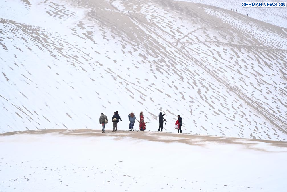 DUNHUANG, 23. November 2025 (Xinhuanet) -- Touristen besuchen das Landschaftsgebiet Mingsha-Berg und Mondsichelquelle in der Stadt Dunhuang in der nordwestchinesischen Provinz Gansu, 23. November 2025. Die bekannten Sehenswürdigkeiten in Dunhuang, die mit einer Schneedecke bedeckt sind, bieten eine atemberaubende Winterlandschaft. (Foto von Zhang Xiaoliang/Xinhua)