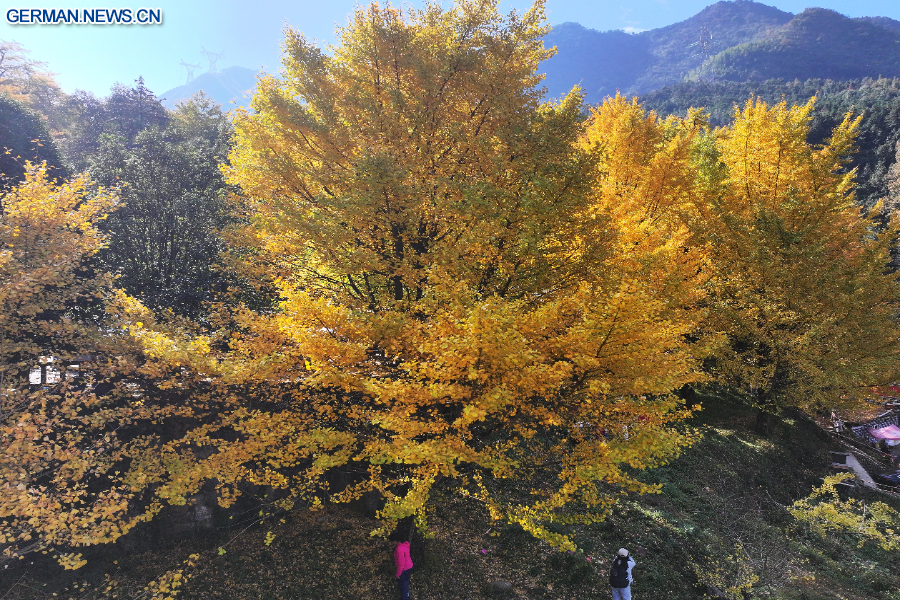 YONGZHOU, 24. November 2025 (Xinhua) -- Die Drohnenaufnahme zeigt Menschen beim Genießen ihrer Freizeit unter Ginkgobäumen im Dorf Tongziao im Kreis Shuangpai der Stadt Yongzhou in der Provinz Hunan in Zentralchina, 23. November 2025. Mehr als 3.000 Ginkgobäume haben sich hier nach und nach golden verfärbt und ziehen viele Touristen an. (Xinhua/Zhao Zhongzhi)