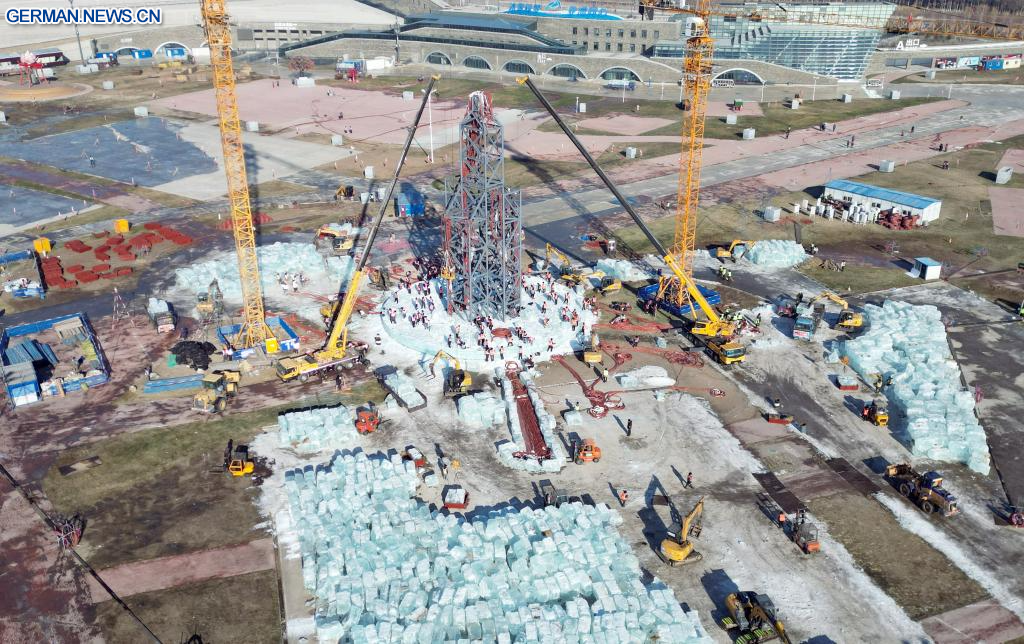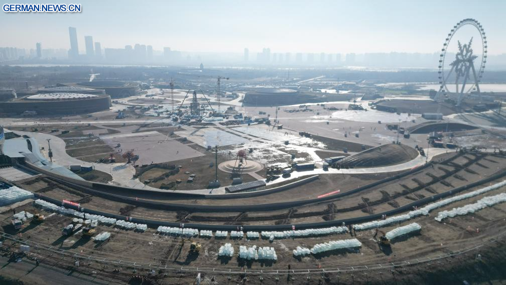 HARBIN, 25. November 2025 (Xinhuanet) -- Das am 25. November 2025 aufgenommene Luftbild einer Drohne zeigt die Baustelle der Harbin Ice-Snow World in Harbin in der nordostchinesischen Provinz Heilongjiang. Die 27. Harbin Ice-Snow World, ein renommiertes saisonales Themenpark in Harbin, hat am Dienstag offiziell mit dem Bau begonnen. (Foto von Liu Yang/Xinhua)