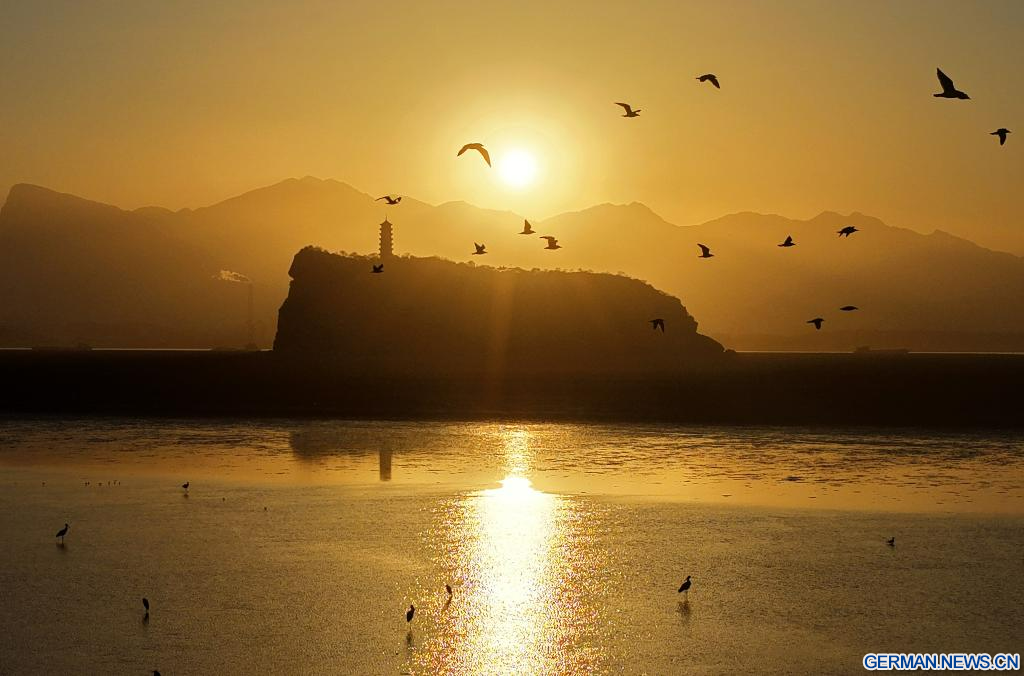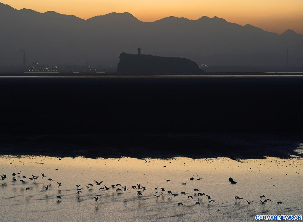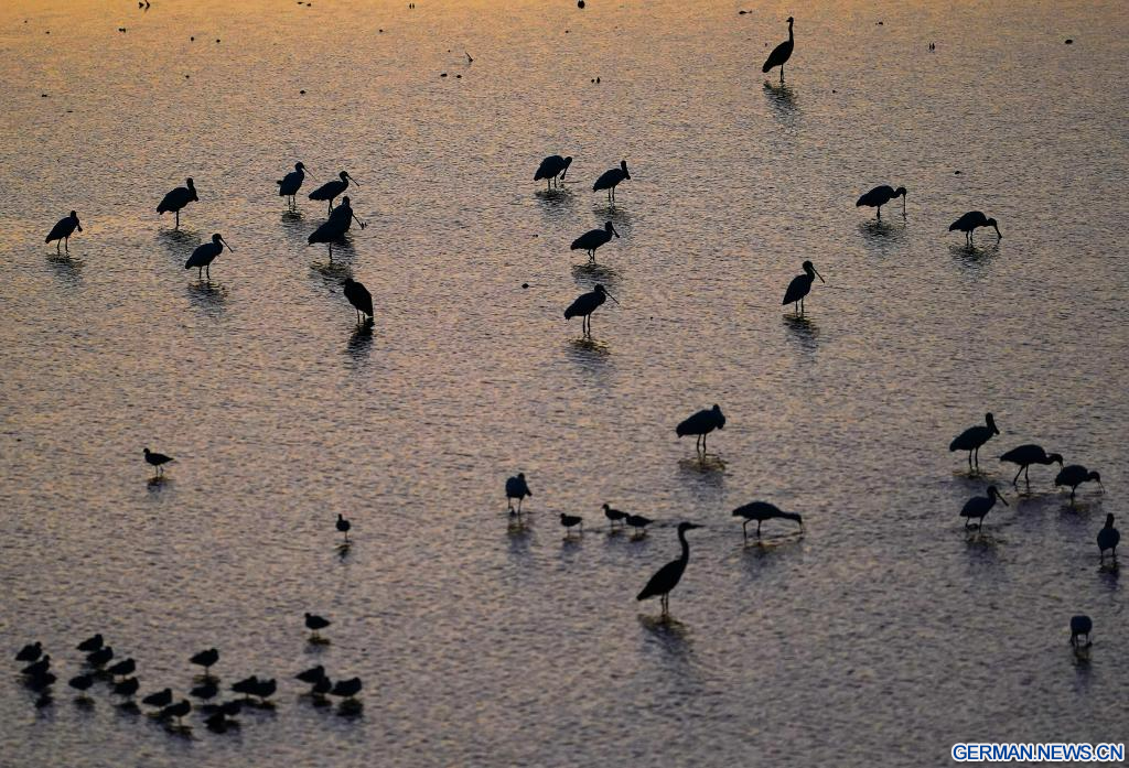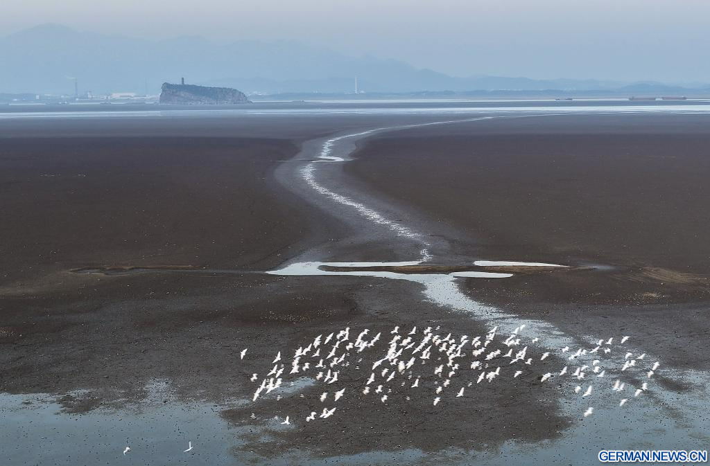JIUJIANG, 27. November 2025 (Xinhuanet) -- Zugvögel ruhen sich auf dem Poyang-See im Kreis Hukou in der ostchinesischen Provinz Jiangxi aus,26. November 2025. (Quelle: Xinhua/Wan Xiang)