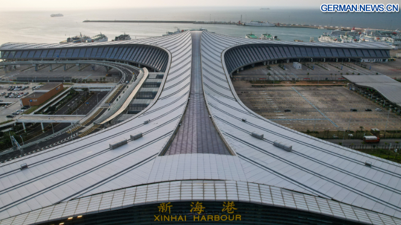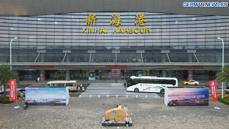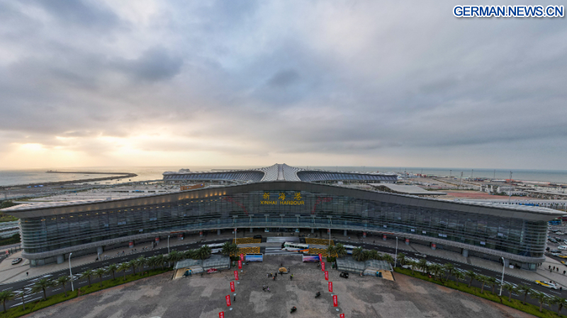 HAIKOU, 19. Dezember 2025 (Xinhua) -- Die Drohnenaufnahme zeigt den Haupteingang des Hafens Xinhai in Haikou in der Provinz Hainan in Südchina, 18. Dezember 2025. China hat am Donnerstag inselweite Sonderzollmaßnahmen im Freihandelshafen Hainan (FTP) eingeführt. (Xinhua/Yang Guanyu)