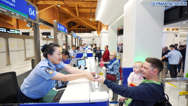 HAIKOU, 19. Dezember 2025 (Xinhua) -- Eine Beamtin der Einwanderungsbehörde wickelt die Grenzformalitäten ankommender Passagiere am internationalen Flughafen Sanya Phoenix in Sanya in der Provinz Hainan in Südchina ab, 18. Dezember 2025. China hat am Donnerstag inselweite Sonderzollmaßnahmen im Freihandelshafen Hainan (FTP) eingeführt. (Foto von Meng Xushun/Xinhua)