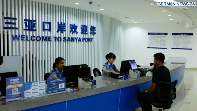 HAIKOU, 19. Dezember 2025 (Xinhua) -- Beamte bearbeiten die Grenzformalitäten für ein Besatzungsmitglied eines Schiffes in Sanya in der Provinz Hainan in Südchina, 18. Dezember 2025. China hat am Donnerstag inselweite Sonderzollmaßnahmen im Freihandelshafen Hainan (FTP) eingeführt. (Foto von Cong Gao/Xinhua)