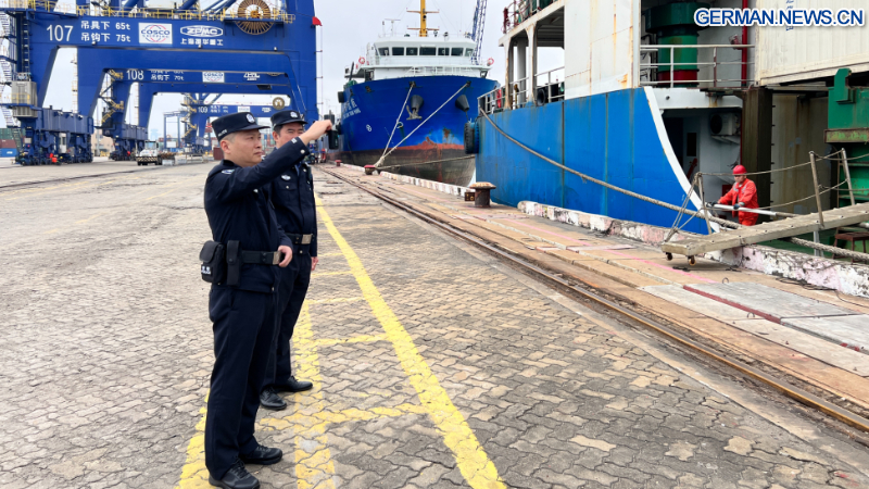 HAIKOU, 19. Dezember 2025 (Xinhua) -- Grenzbeamte patrouillieren in einem Hafen in Xiuying in Haikou in der Provinz Hainan in Südchina, 18. Dezember 2025. China hat am Donnerstag inselweite Sonderzollmaßnahmen im Freihandelshafen Hainan (FTP) eingeführt. (Foto von Yang Jiyong/Xinhua)