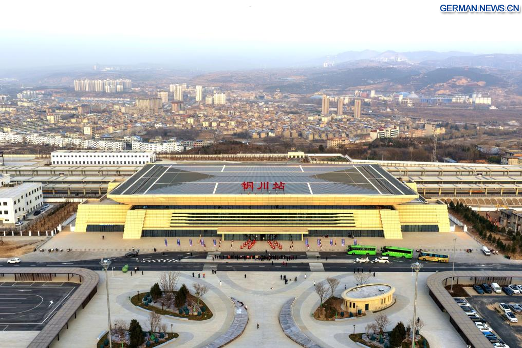 TONGCHUAN, 24. Dezember 2025 (Xinhuanet) -- Die Luftaufnahme einer Drohne vom 24. Dezember 2025 zeigt den Bahnhof Tongchuan einer Hochgeschwindigkeitsbahnstrecke, die Xi'an mit Yan'an in der nordwestchinesischen Provinz Shaanxi verbindet. (Quelle: Xinhua/Xing Guangli)