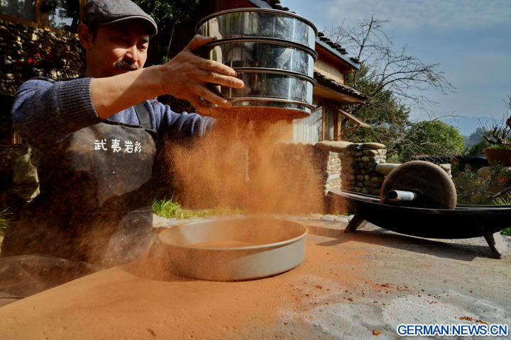 WUYISHAN, 25. Dezember 2025 (Xinhua) -- Ein Künstler siebt Gesteins- und Bodenpulver in der Stadt Wuyishan in der Provinz Fujian im Südosten Chinas, 19. Dezember 2025. Wuyishan verfügt über eine große Vielfalt an farbenfrohen Gesteinen und Erden, die als natürliche Palette für die Malerei dienen und die unverwechselbare Wuyi-Gesteinspigmentkunst hervorgebracht haben. Durch die Integration moderner künstlerischer Elemente und Techniken in die Tradition wird die Wuyi-Gesteinspigmentmalerei allmählich zu einem einzigartigen kulturellen Merkmal von Wuyishan. (Foto von Chen Ying/Xinhua)