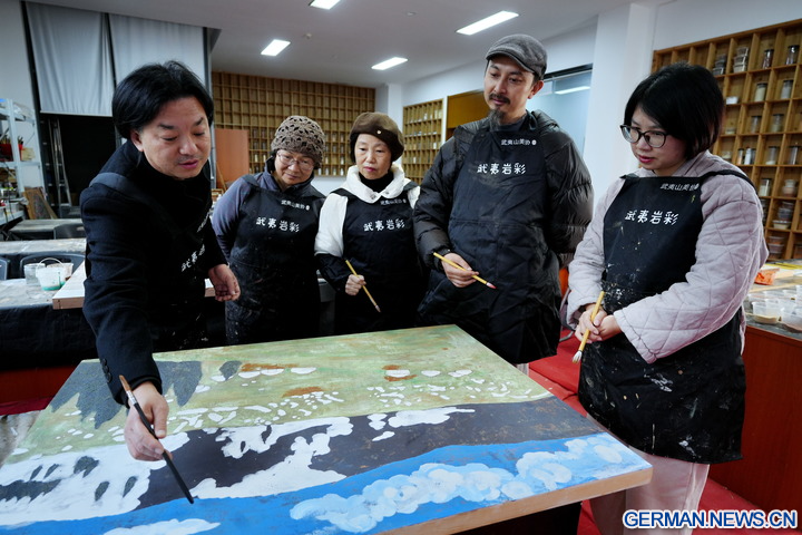 WUYISHAN, 25. Dezember 2025 (Xinhua) -- Ein Künstler arbeitet an einem Gemälde mit Farben aus Gesteinspigmenten in der Stadt Wuyishan in der Provinz Fujian im Südosten Chinas, 5. Dezember 2025. Wuyishan verfügt über eine große Vielfalt an farbenfrohen Gesteinen und Erden, die als natürliche Palette für die Malerei dienen und die unverwechselbare Wuyi-Gesteinspigmentkunst hervorgebracht haben. Durch die Integration moderner künstlerischer Elemente und Techniken in die Tradition wird die Wuyi-Gesteinspigmentmalerei allmählich zu einem einzigartigen kulturellen Merkmal von Wuyishan. (Foto von Chen Ying/Xinhua)