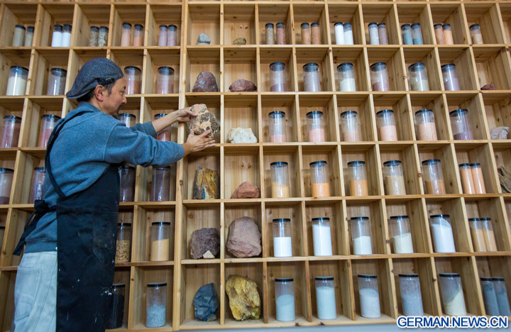 WUYISHAN, 25. Dezember 2025 (Xinhua) -- Ein Künstler präsentiert Gesteinspigmente in der Stadt Wuyishan in der Provinz Fujian im Südosten Chinas, 22. Dezember 2025. Wuyishan verfügt über eine große Vielfalt an farbenfrohen Gesteinen und Erden, die als natürliche Palette für die Malerei dienen und die unverwechselbare Wuyi-Gesteinspigmentkunst hervorgebracht haben. Durch die Integration moderner künstlerischer Elemente und Techniken in die Tradition wird die Wuyi-Gesteinspigmentmalerei allmählich zu einem einzigartigen kulturellen Merkmal von Wuyishan. (Foto von Chen Ying/Xinhua)