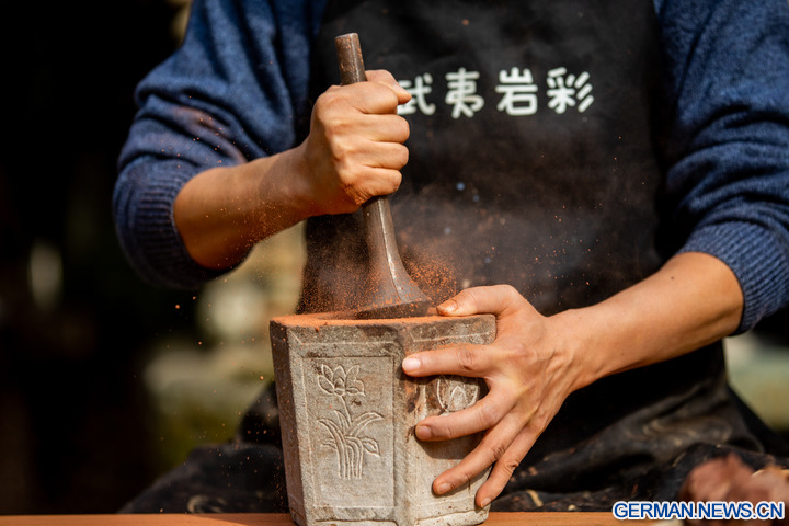 WUYISHAN, 25. Dezember 2025 (Xinhua) -- Ein Künstler zermahlt Gestein und Erde zu Pulver in der Stadt Wuyishan in der Provinz Fujian im Südosten Chinas, 19. Dezember 2025. Wuyishan verfügt über eine große Vielfalt an farbenfrohen Gesteinen und Erden, die als natürliche Palette für die Malerei dienen und die unverwechselbare Wuyi-Gesteinspigmentkunst hervorgebracht haben. Durch die Integration moderner künstlerischer Elemente und Techniken in die Tradition wird die Wuyi-Gesteinspigmentmalerei allmählich zu einem einzigartigen kulturellen Merkmal von Wuyishan. (Foto von Chen Ying/Xinhua)
