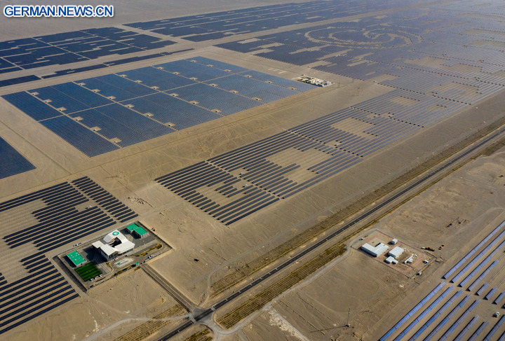 Die Luftaufnahme einer Drohne zeigt ein Photovoltaikprojekt mit einer Leistung von vier Millionen Kilowatt im Kreis Ruoqiang in der Mongolischen Autonomen Präfektur Bayingolin im Uigurischen Autonomen Gebiet Xinjiang im Nordwesten Chinas, 22. September 2025. (Quelle: Xinhua/Chen Shuo)