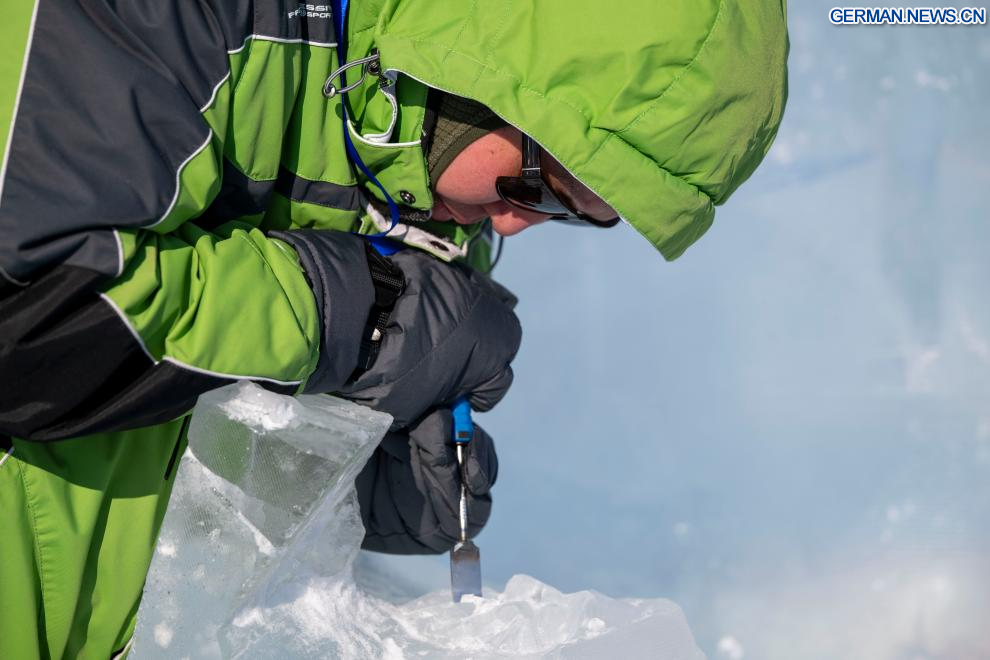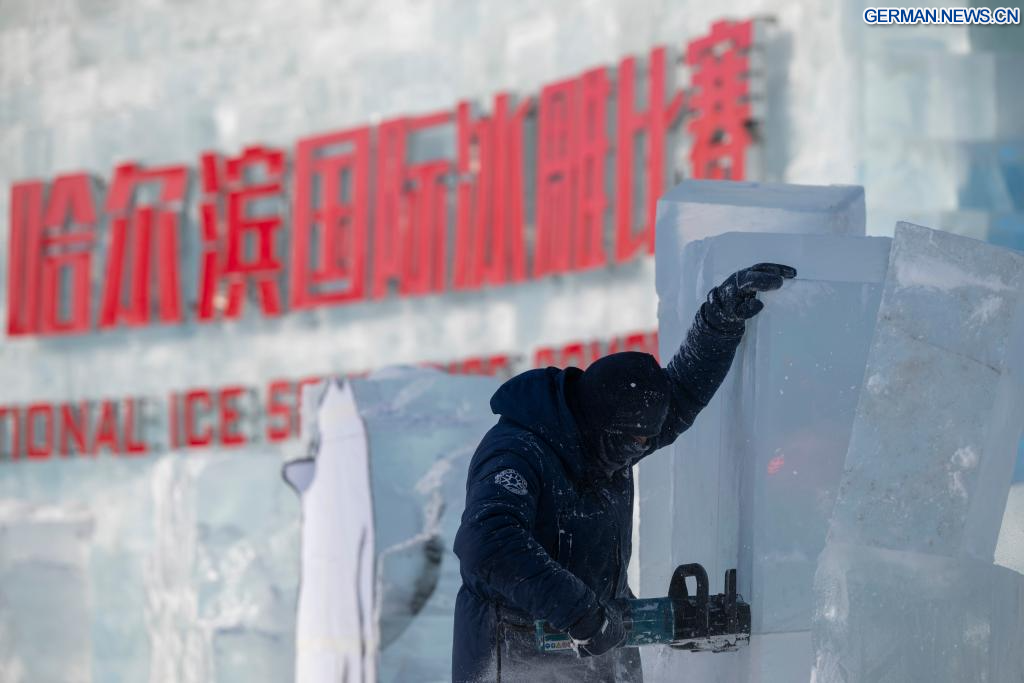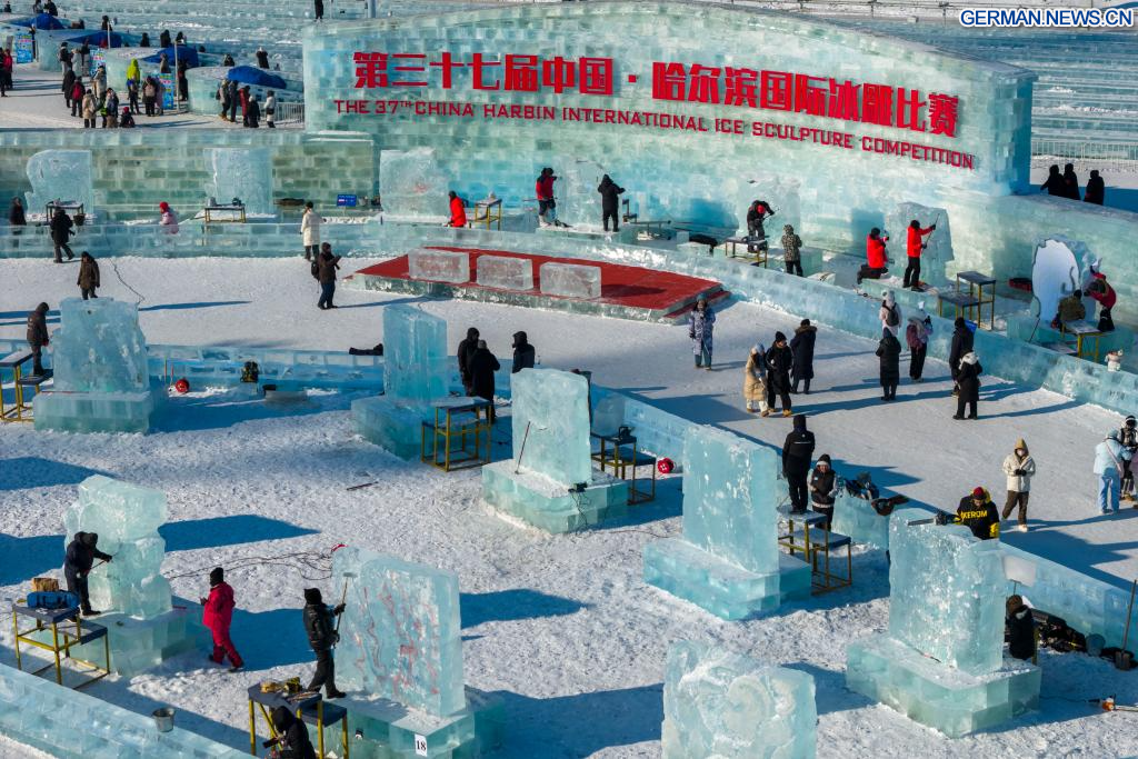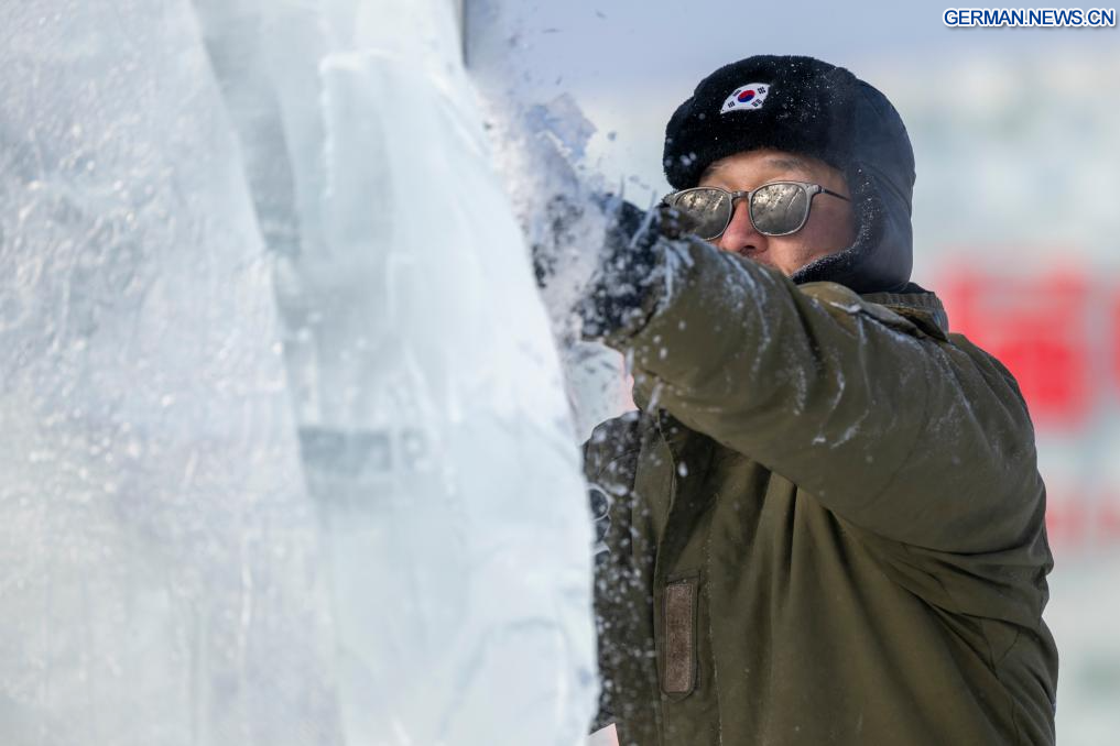 HARBIN, 2. Januar 2026 (Xinhuanet) -- Ein Wettbewerber arbeitet an einer Eisskulptur während des 37. Internationalen Eisskulpturenwettbewerbs China Harbin in der Eis- und Schneewelt von Harbin in der nordostchinesischen Provinz Heilongjiang, 2. Januar 2026. Der Wettbewerb begann hier am Freitag. (Quelle: Xinhua/Zhang Tao)