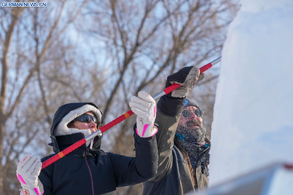 HARBIN, 6. Januar 2026 (Xinhuanet) -- Teilnehmer arbeiten an einer Schneeskulptur auf dem Gelände der Sun Island International Snow Sculpture Art Expo in Harbin in der nordostchinesischen Provinz Heilongjiang, 6. Januar 2026. Der 28. internationale Schneeskulpturenwettbewerb in Harbin begann hier am Dienstag und zog 25 Teams von Schneeskulpturenkünstlern aus 13 Ländern an. (Quelle: Xinhua/Wang Jianwei)