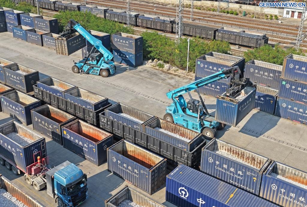 NANNING, 8. Januar 2026 (Xinhuanet) -- Das am 8. Januar 2026 aufgenommene Luftbild einer Drohne zeigt den Internationalen Eisenbahnhafen von Nanning in Nanning im südchinesischen Autonomen Gebiet Guangxi der Zhuang. Der Zugdienst des Neuen Internationalen Land-See-Handelskorridors von China habe im Jahr 2025 eine Rekordfrachtmenge von 1,425 Millionen Zwanzig-Fuß-Standardcontainern (TEU) abgewickelt, was einem Anstieg von 47,6 Prozent entspreche und erstmals die Marke von einer Million TEU überschreite, teilte die China Railway Nanning Group am Dienstag mit. (Quelle: Xinhua/Zhou Hua)