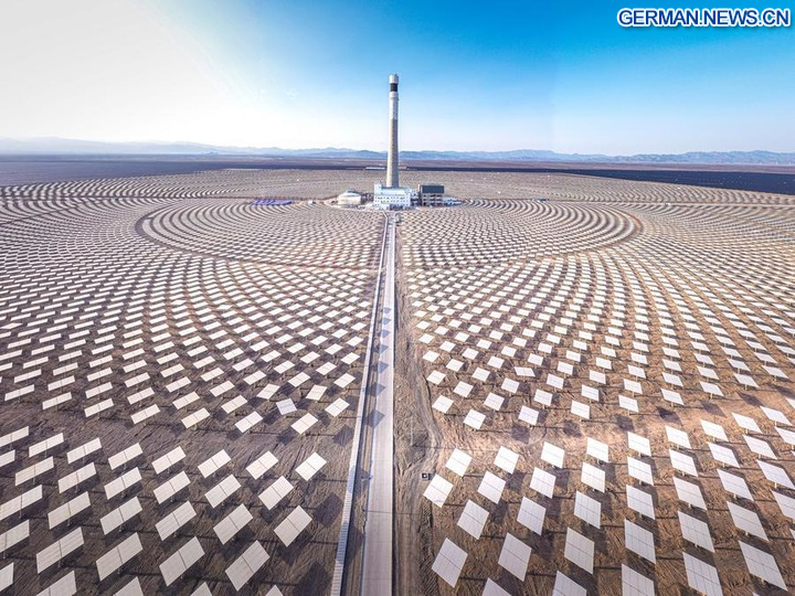 Die Luftaufnahme einer Drohne zeigt ein 1-Gigawatt-Projekt zur Integration von Solarthermie und Photovoltaik im Kreis Shanshan im Uigurischen Autonomen Gebiet Xinjiang im Nordwesten Chinas, 28. Juli 2025. (Foto von Xu Zipeng/Xinhua)
