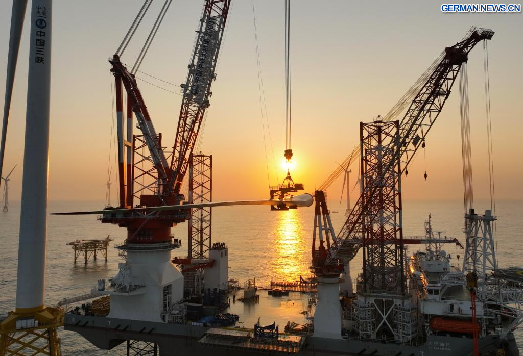 ZHANGZHOU, 13. Januar 2026 (Xinhuanet) -- Dieses am 13. Januar 2026 aufgenommene Drohnenfoto zeigt eine der Turbinenblätter, die auf der Baustelle einer 20-Megawatt-Offshore-Windkraftanlage in den Küstengewässern der südostchinesischen Provinz Fujian hochgezogen wird. Die Windkraftanlage wurde hier am Dienstag erfolgreich hochgezogen und installiert. (Quelle: Xinhua/Lin Shanchuan)