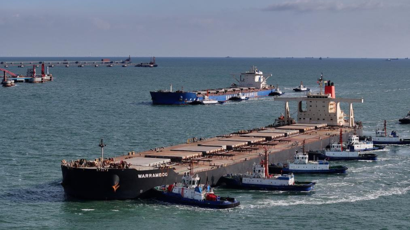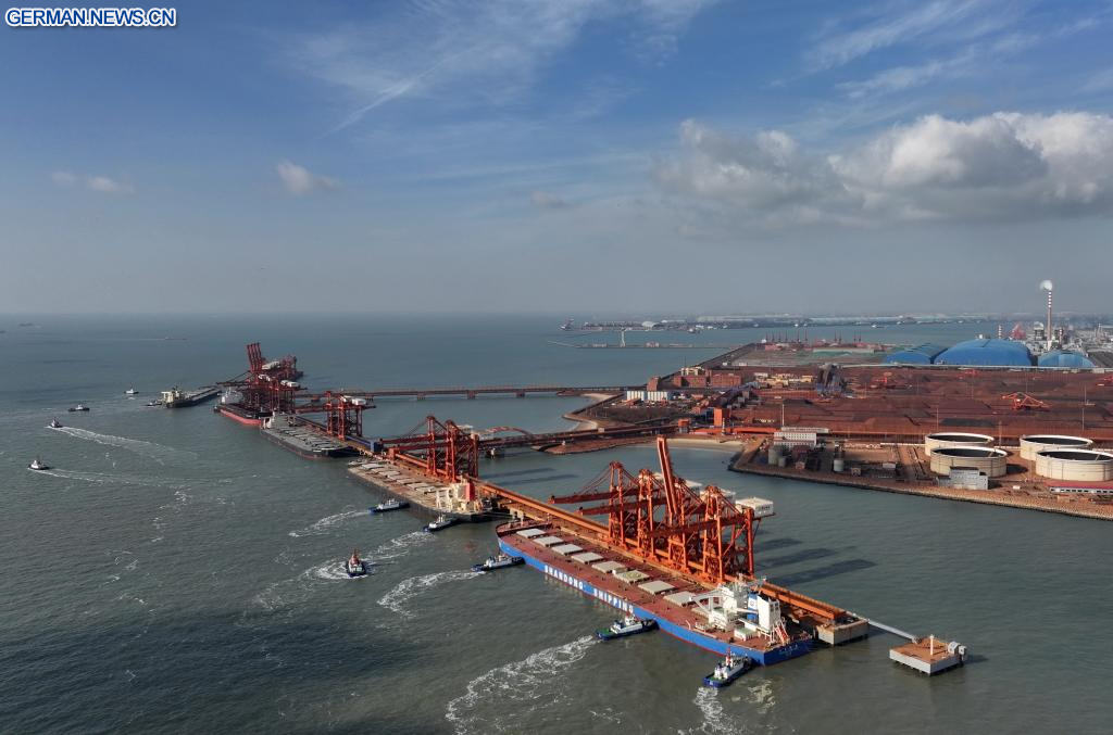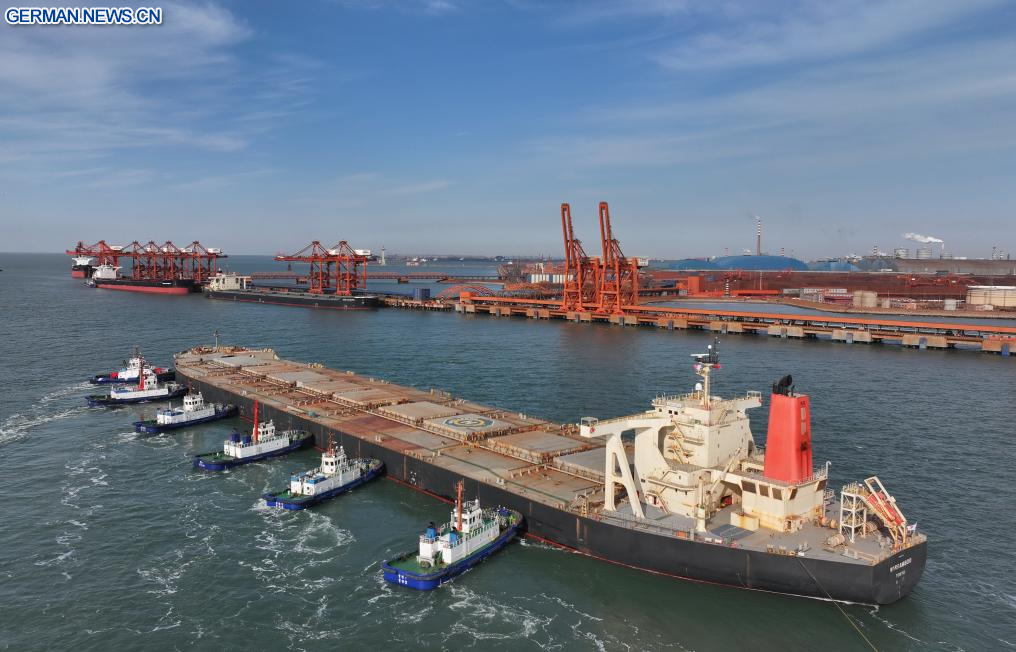 TANGSHAN, 13. Januar 2026 (Xinhuanet) -- Das am 13. Januar 2026 aufgenommene Drohnenfoto zeigt ein Massengutschiff, das mit Hilfe von Schleppern am Erzterminal des Hafengebiets Caofeidian im Hafen von Tangshan in Tangshan in der nordchinesischen Provinz Hebei anlegt. Der Hafen von Tangshan erzielte 2025 einen Gesamtfrachtumschlag von 883,99 Millionen Tonnen, was einem Anstieg von 2,53 Prozent im Jahresvergleich entspricht. (Quelle: Xinhua/Yang Shiyao)