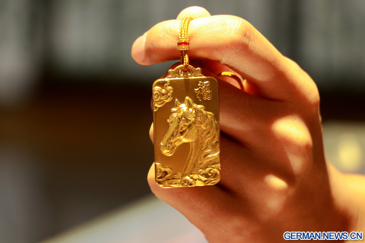 BEIJING, 21. Januar 2026 (Xinhua) -- Das Foto zeigt ein Goldprodukt zum Thema „Jahr des Pferdes“ in einem Geschäft in der Stadt Binzhou in der Provinz Shandong in Ostchina, 16. Januar 2026. (Foto von Chu Baorui/Xinhua)