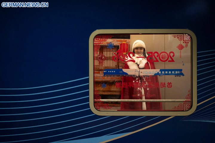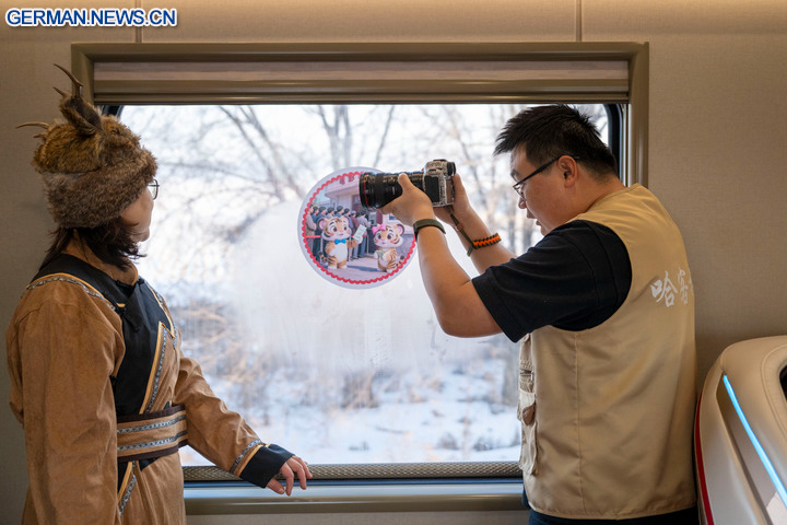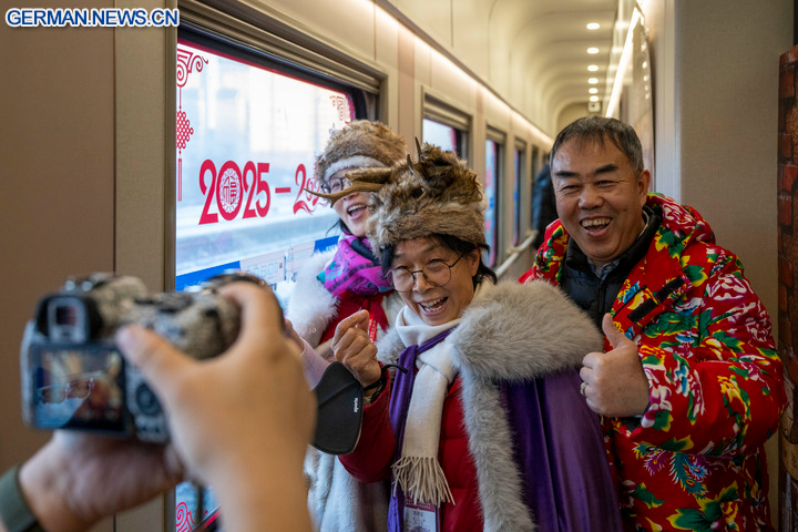 HARBIN, 26. Januar 2026 (Xinhua) -- Passagiere posieren für Fotos im Zug Y783 in der Provinz Heilongjiang im Nordosten Chinas, 25. Januar 2026. Am Sonntag wurde in Harbin der Zug Y783 in Betrieb genommen, ein themenbezogener Tourismuszug mit einem Reisefotografie-Service, der nach Yabuli fährt. Es ist das erste Angebot dieser Art, das das Unternehmen in diesem Jahr anbietet. Der Zug wird von der China Railway Harbin Group Co., Ltd. betrieben und ermöglicht es den Passagieren, verschiedene Kostüme anzuziehen und Fotodienste in Anspruch zu nehmen. (Xinhua/Zhang Tao)