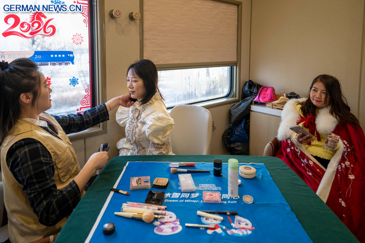 HARBIN, 26. Januar 2026 (Xinhua) -- Eine Passagierin wird geschminkt im Zug Y783 in der Provinz Heilongjiang im Nordosten Chinas, 25. Januar 2026. Am Sonntag wurde in Harbin der Zug Y783 in Betrieb genommen, ein themenbezogener Tourismuszug mit einem Reisefotografie-Service, der nach Yabuli fährt. Es ist das erste Angebot dieser Art, das das Unternehmen in diesem Jahr anbietet. Der Zug wird von der China Railway Harbin Group Co., Ltd. betrieben und ermöglicht es den Passagieren, verschiedene Kostüme anzuziehen und Fotodienste in Anspruch zu nehmen. (Xinhua/Zhang Tao)