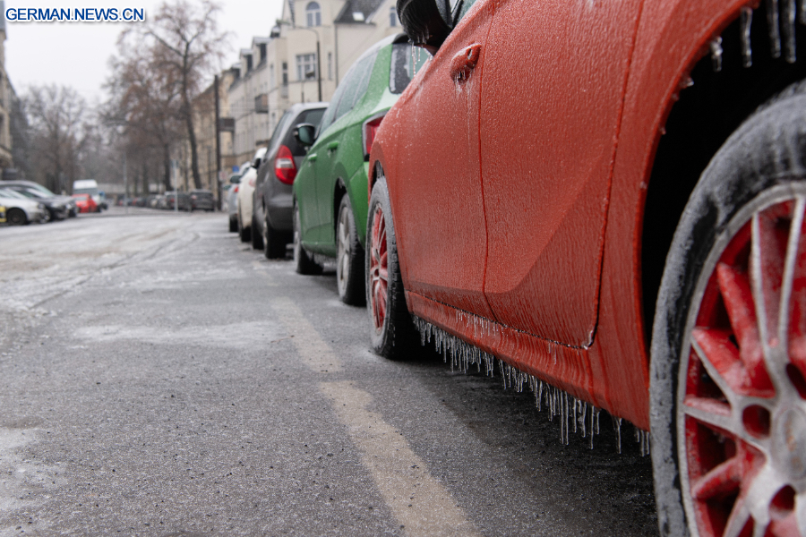 BERLIN, 27. Januar 2026 (Xinhua) -- Das Foto zeigt vereiste Fahrzeuge im Berliner Stadtbezirk Pankow, 26. Januar 2026. In Berlin kam es am Montag zu Glatteis, was zu Störungen im Straßenbahnverkehr und anderen öffentlichen Verkehrsmitteln führte. (Xinhua/Zhang Haofu)