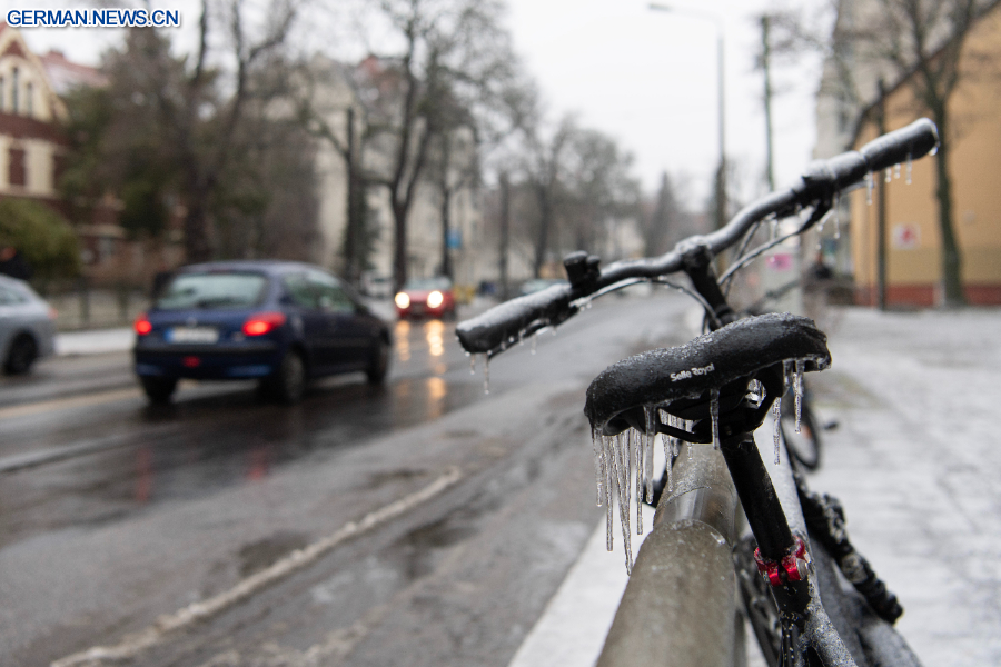 BERLIN, 27. Januar 2026 (Xinhua) -- Das Foto zeigt ein mit Eis bedecktes Fahrrad im Berliner Stadtbezirk Pankow, 26. Januar 2026. In Berlin kam es am Montag zu Glatteis, was zu Störungen im Straßenbahnverkehr und anderen öffentlichen Verkehrsmitteln führte. (Xinhua/Zhang Haofu)